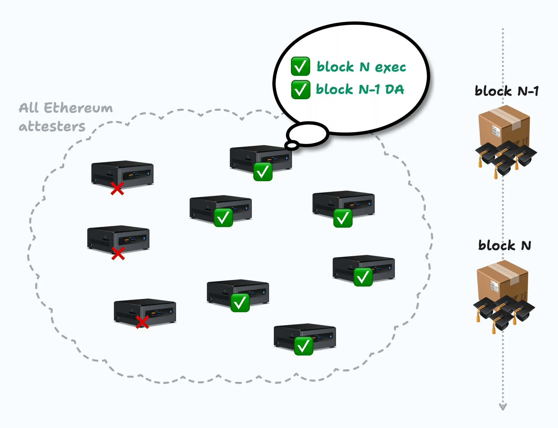 This step ensures that, between committee members, enough honest members custody the blob data and attest that the transaction is valid. The QC is a reflection of that. However, the existence of a QC does not guarantee DA at network-level, as the attesters haven’t voted yet. They can be thought of as a “credible signal”, but not guaranteed availability.